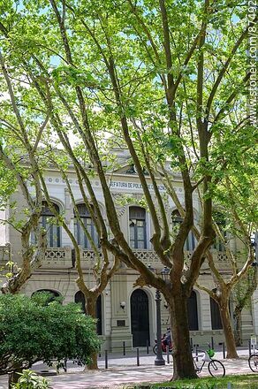 Durazno Police Headquarters behind the banana trees in Plaza Independencia