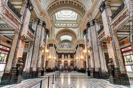 Salón principal del Palacio donde se pueden apreciar las decoraciones en mármoles, granitos, basaltos y pórfidos de la zona este de nuestro país (Maldonado, Treinta y Tres y Lavalleja). Dos grandes vitrales coronan las entradas a las Antecámaras de Senadores y Diputados diseñados por el italiano Giovanni Buffa, representando la Justicia y el Trabajo respectivamente. A los lados de dichas entradas encontramos bajorrelieves en yeso pulido del escultor nacional Edmundo Prati, representando hechos históricos nacionales. En los arcos de ambos extremos del Salón se pueden apreciar mosaicos venecianos donde se distinguen las Ciencias (al sur) y las Artes (al norte) diseñados por Buffa y realizados por la Cooperativa de Artesanos del Mosaico de Venecia. En el techo de la nave central, a los lados de los vitrales superiores, encontramos bajorrelieves realizados por el escultor nacional José Belloni representando los cuatro símbolos del Escudo Nacional. Los vitrales de las ventanas de las galerías fueron realizadas por el uruguayo Arturo Marehetti.