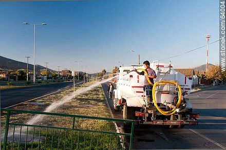 Camión cisterna regando el cantero central de la calle Condell