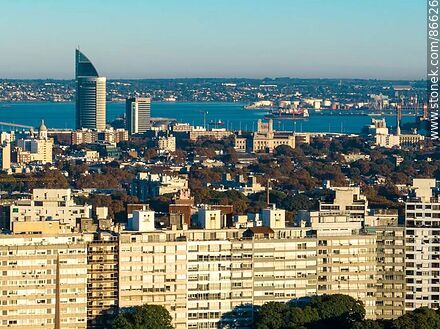 Vista aérea de los edificios de Bvar. Artigas y la Av. 18 de Julio. Al fondo la torre de Antel, Aguada Park, Palacio Legislativo y la bahía de Montevideo. | Foto #86626